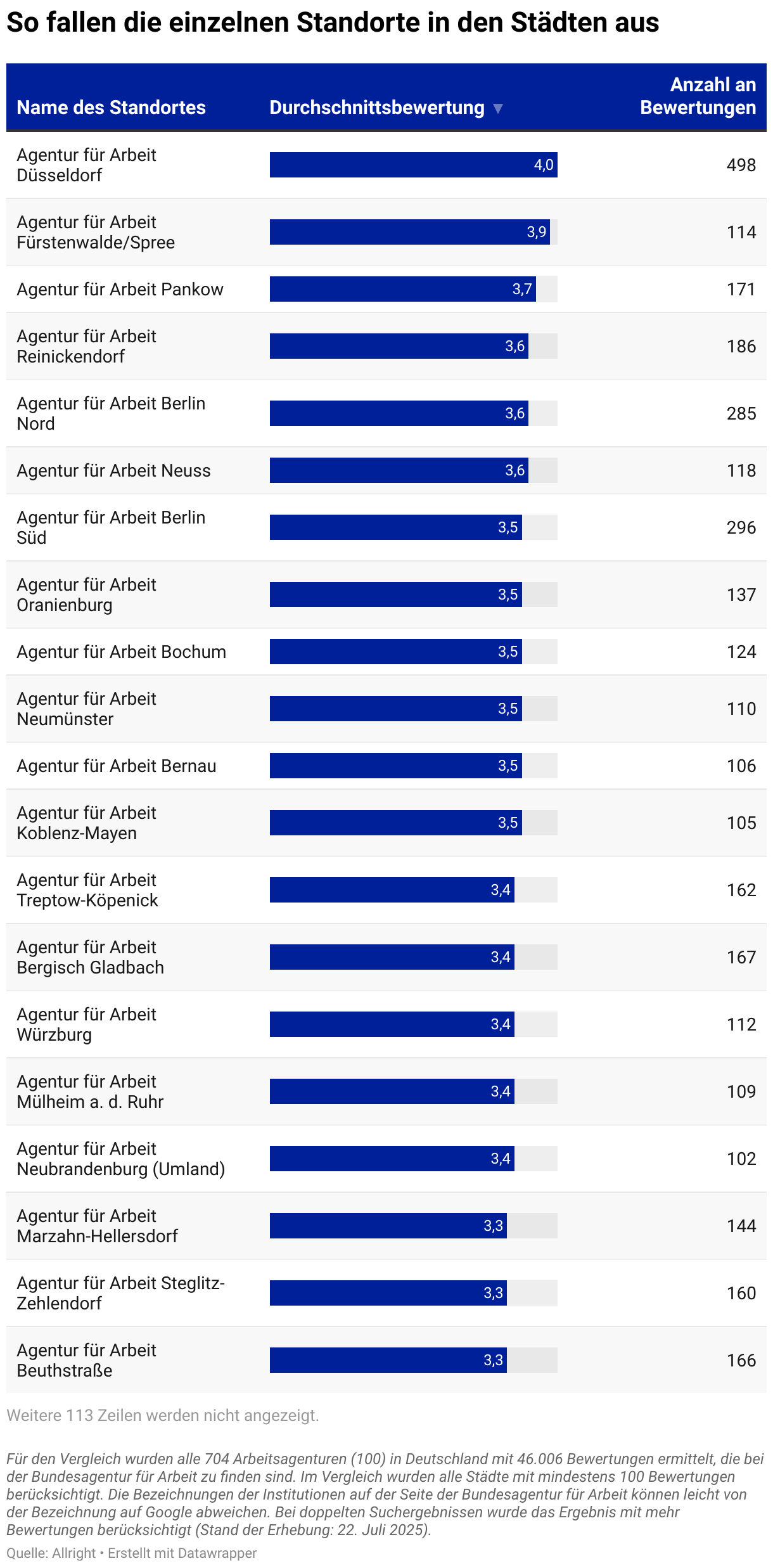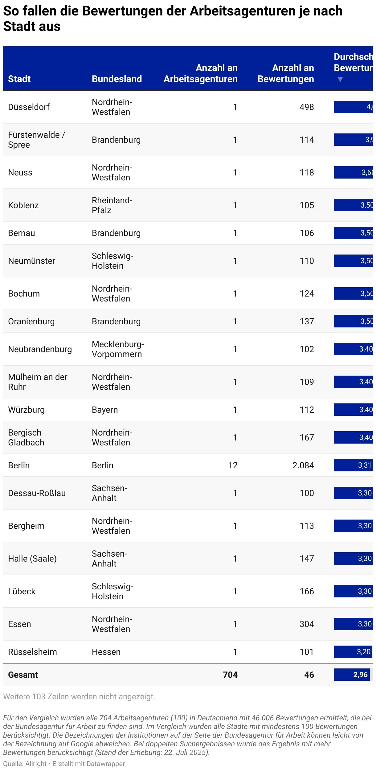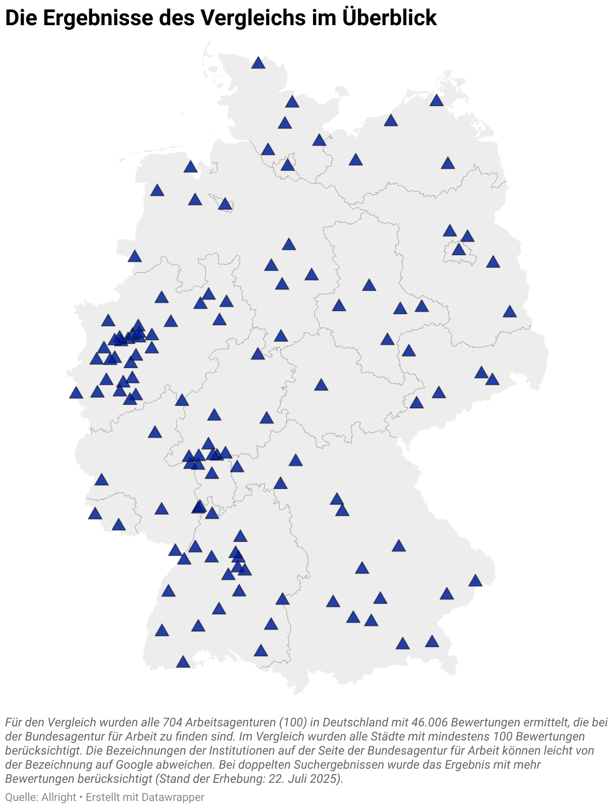 Für den Vergleich wurden alle 704 Arbeitsagenturen (100) in Deutschland mit 46.006 Bewertungen ermittelt, die bei der Bundesagentur für Arbeit zu finden sind. Im Vergleich wurden alle Städte mit mindestens 100 Bewertungen berücksichtigt. Die Bezeichnungen der Institutionen auf der Seite der Bundesagentur für Arbeit können leicht von der Bezeichnung auf Google abweichen. Bei doppelten Suchergebnissen wurde das Ergebnis mit mehr Bewertungen berücksichtigt (Stand der Erhebung: 22. Juli 2025).