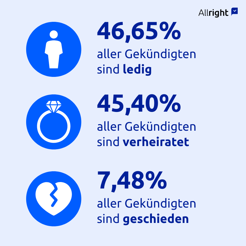 Die Auswertung macht auch deutlich: 61 Prozent der Gekündigten sind Männer, 39 Prozent Frauen. Betrachtet man den Familienstand, sind 46,7 Prozent der Betroffenen ledig, 45,4 Prozent verheiratet und 7,5 Prozent geschieden. Verwitwete spielen mit nur 0,4 Prozent eine eher geringe Rolle. „Eine Kündigung stellt für alle Betroffenen eine erhebliche Belastung dar – für Verheiratete kann sie jedoch besonders einschneidend sein, da hier oft eine ganze Familie vom Einkommen abhängt“, erklärt Krusenotto. Er weist darauf hin, dass bei betriebsbedingten Kündigungen soziale Kriterien wie Dauer der Betriebszugehörigkeit, Unterhaltspflichten und das Alter zwingend zu berücksichtigen sind, wenn eine Auswahlentscheidung zwischen vergleichbaren Arbeitnehmern getroffen wird. „Ist das nicht geschehen, haben Arbeitnehmer gute Chancen, die Kündigung erfolgreich anzufechten.“ Krusenotto empfiehlt, im Kündigungsfall rasch zu handeln und rechtliche Schritte zu prüfen, um keine Fristen zu versäumen.