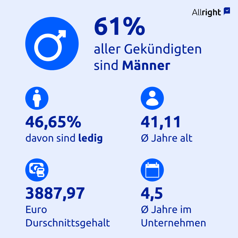 Im Falle einer Kündigung wird arbeitsrechtlich zwischen einer ordentlichen und einer außerordentlichen (fristlosen) Kündigung unterschieden. Laut der Allright-Auswertung erhielten knapp 16,2 Prozent der Arbeitnehmer eine außerordentlich fristlose Kündigung. „Um rechtlich zulässig zu sein, muss eine außerordentliche Kündigung auf einem schweren Vergehen, wie zum Beispiel Diebstahl oder Beleidigung gegenüber dem Arbeitgeber, beruhen. In solchen Situationen sollten Arbeitnehmer daher unbedingt prüfen lassen, ob die Kündigung gerechtfertigt ist, da für eine außerordentlich fristlose Kündigung strenge Voraussetzungen erfüllt sein müssen“, fügt Krusenotto hinzu.