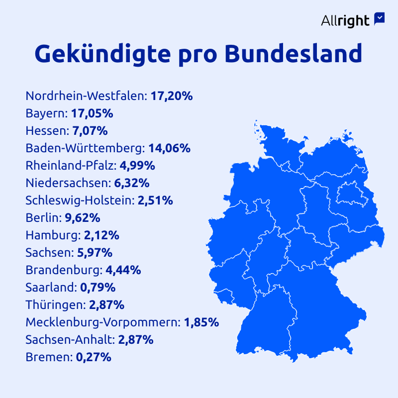 Die meisten Gekündigten kamen im Übrigen aus Nordrhein-Westfalen (17,2 Prozent). Häufig gekündigt wurde auch in Bayern (17,1 Prozent) und Baden-Württemberg (14,1 Prozent). Die wenigsten Gekündigten kommen dagegen aus Bremen (0,8 Prozent), Saarland (0,8 Prozent) und Mecklenburg-Vorpommern (1,9 Prozent).
