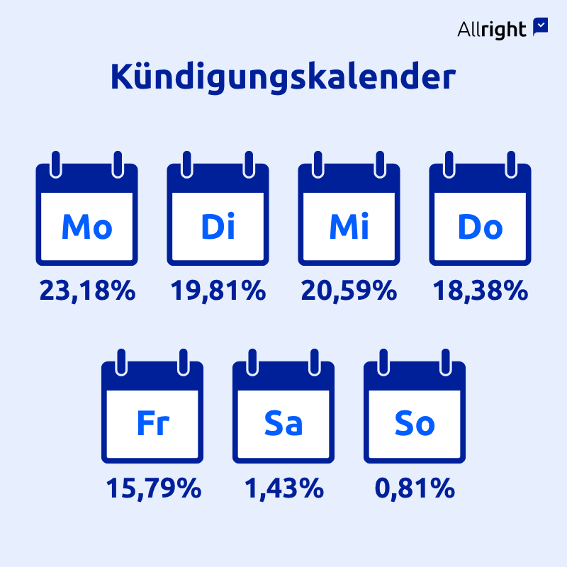 Die meisten Arbeitnehmer (23,2 Prozent) erhielten ihre Kündigung an einem Montag, dicht gefolgt vom Mittwoch mit 20,6 Prozent. Am Dienstag wurden 19,8 Prozent, am Donnerstag 18,4 Prozent und am Freitag 15,8 Prozent der Kündigungen ausgesprochen. Und Kündigungen werden auch am Wochenende ausgesprochen, wenn auch wenig: 1,4 Prozent erhielten ihre Kündigung an einem Samstag und 0,8 Prozent an einem Sonntag.
